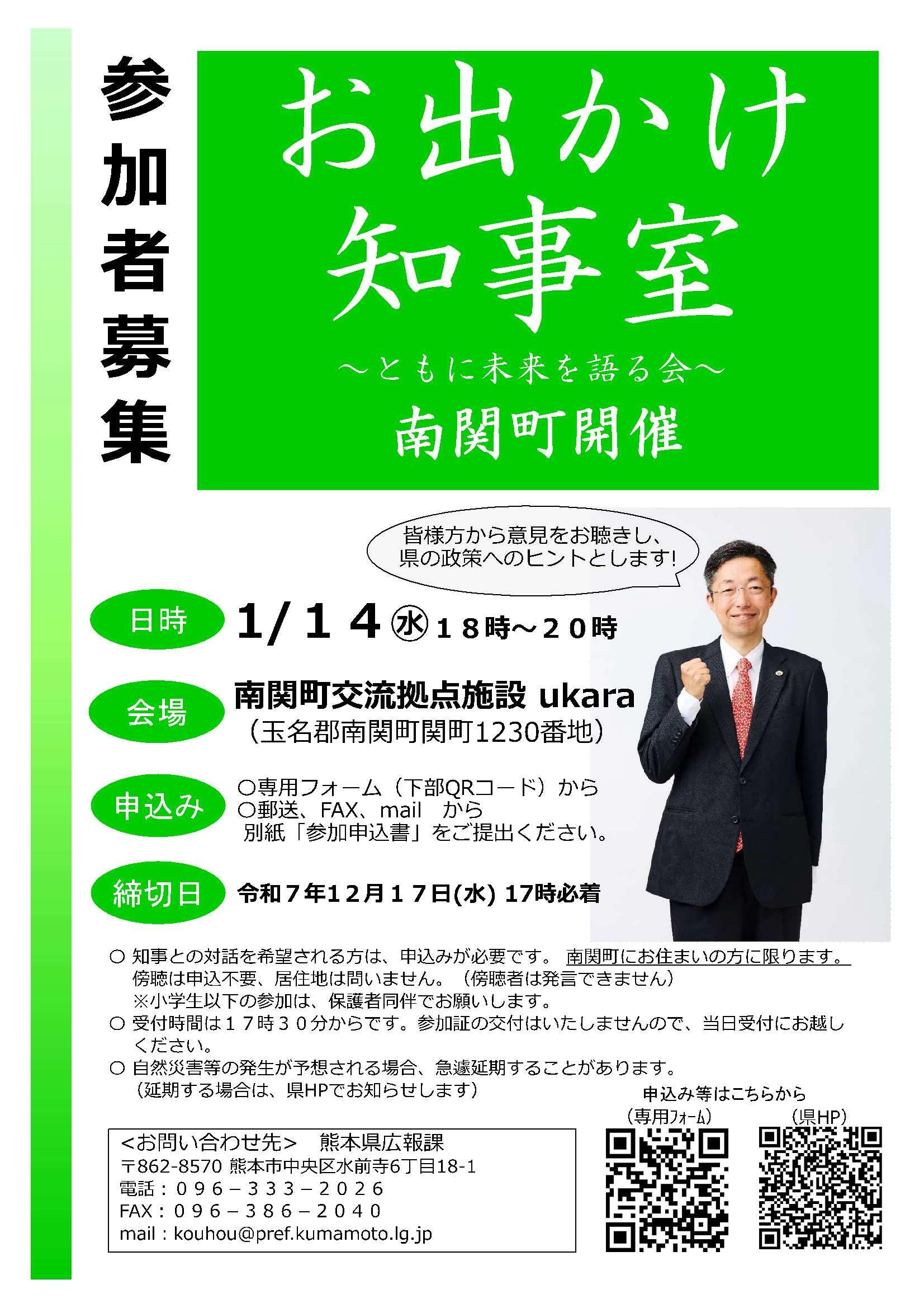 熊本県主催のおでかけ知事室が令和8年1月14日、水曜日の午後6時から 南関町交流拠点施設〈ukara〉で開催されます。 知事との対話を希望される方は、事前申し込みが必要です。 ※申し込みができる方は、南関町在住の方のみとなっています。