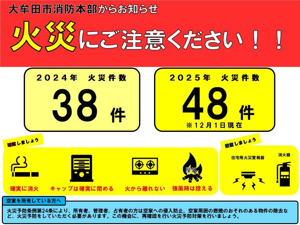 【大牟田市消防本部からのお知らせ】 年末を前に、改めて“火の用心”! 今年は市内で火災が増加しています。 ほんの少しの油断が、大切な命と住まいを危険にさらします。 ・寝たばこは絶対にしない、させない ・ストーブ、暖房機器の周囲には物を置かない ・調理中は火をけすまで目を離さない ・プラグやコンセントのホコリは放置しない ・空き家の関係者の方は、火災予防の対策する これらを含む“10の火災予防ポイント”を大牟田市消防本部ホームページで紹介中です。 みなさん、ご家庭でもぜひご確認ください。 ▼大牟田市消防本部HP▼ www.city.omuta.lg.jp/kiji00321041/index.html 写真はこちら ai-jo.net/content/images/1765279302.jpg