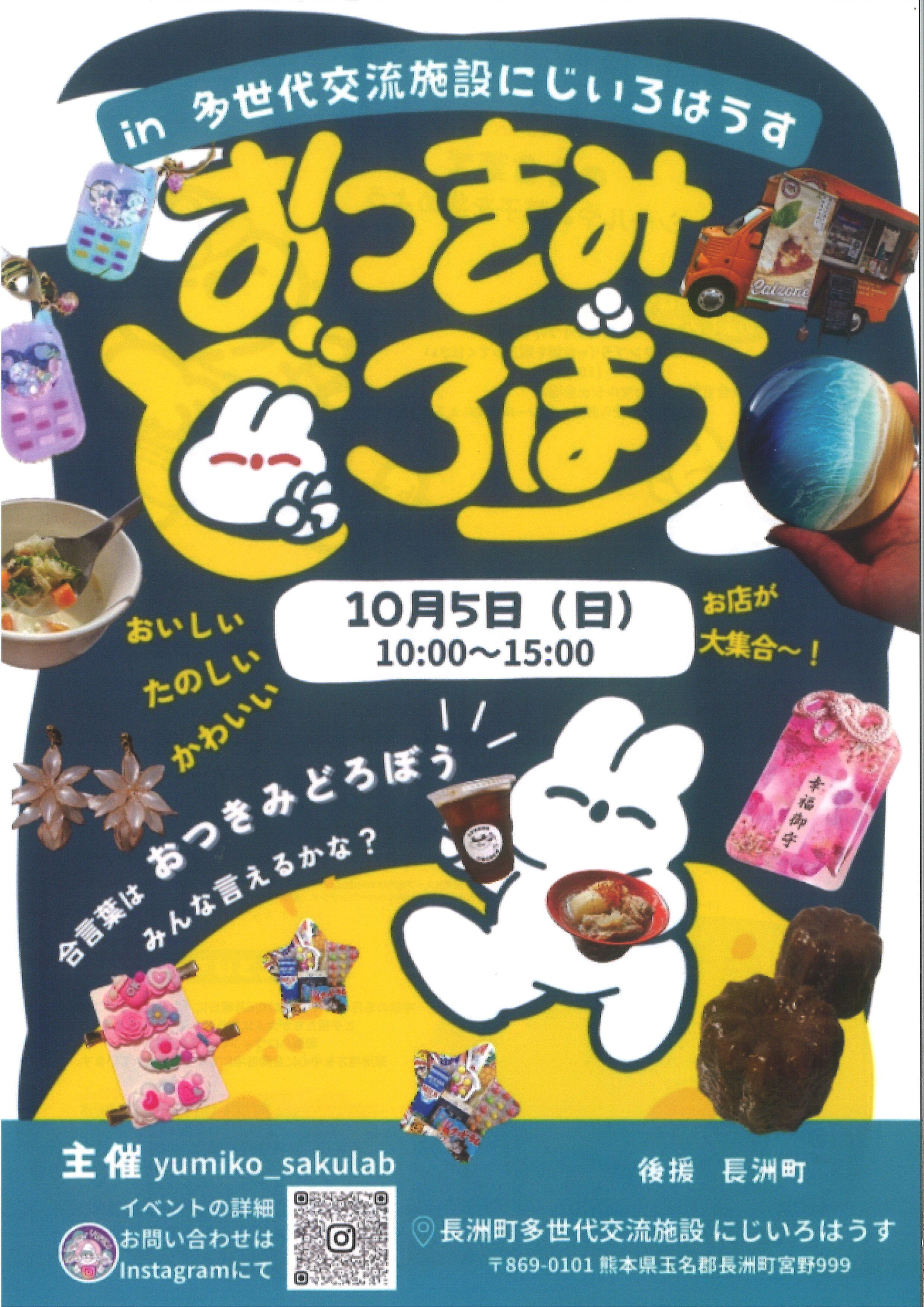 本日午前10時より「おつきみどろぼう」のイベントを長洲町多世代交流施設にじいろはうすで開催します。こどもから大人まで楽しめる内容がもりだくさんです。どうぞご家族みなさんでお越しください。なお、駐車場には限りがありますので、なるべく乗り合わせでお越しいただきますようお願いいたします。 《お問い合わせ》 にじいろはうす☎79-8211 写真はこちら ai-jo.net/content/images/1759571698.jpg