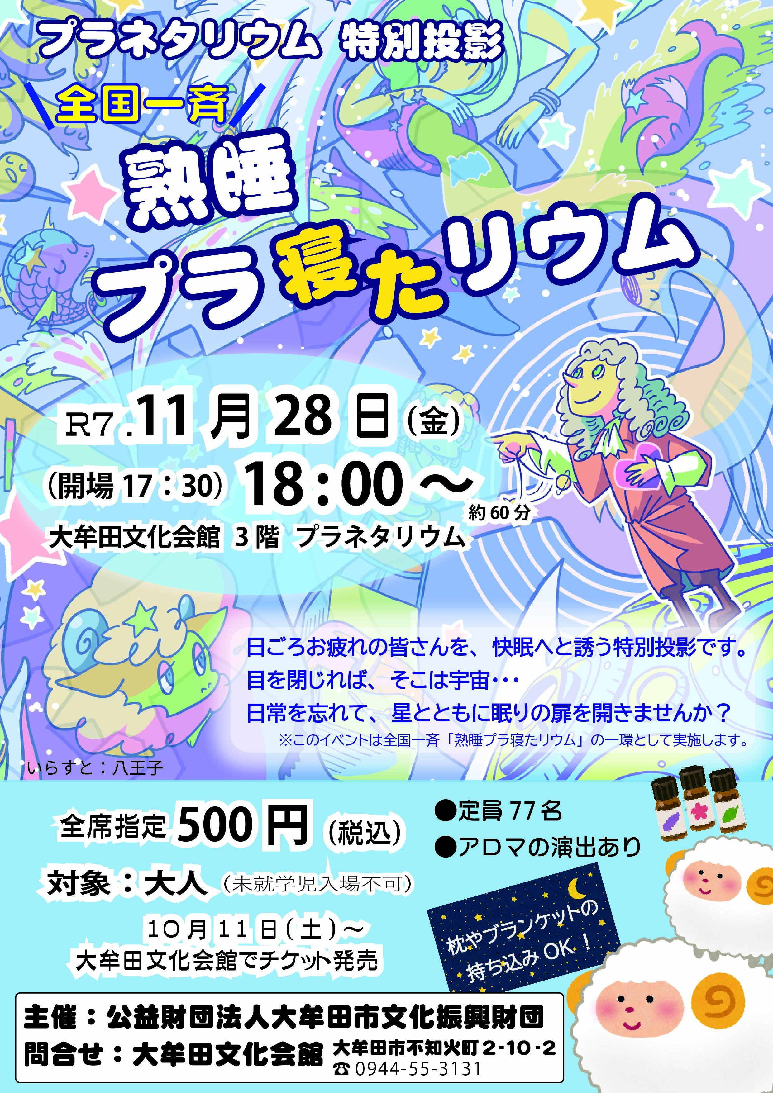 日ごろお疲れの皆さんを、快眠へと誘う特別投影です。  目を閉じれば、そこは宇宙・・・ 日常を忘れて、星とともに眠りの扉を開きませんか?                       ■開催日時  11月28日(金)開演18:00~ (開場17:30) ※約1時間                       ■対  象  大人(推奨) ※未就学児入場不可                              ■入 場 料  全席指定500円(定員77名)                       ■発 売 日  10月11日(土)~