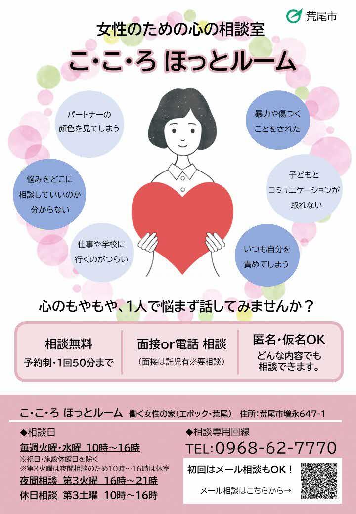 ~女性のための心の相談室「こ・こ・ろ ほっとルーム」~ 【相談日】 毎週火曜・水曜 10:00~12:00、13:00~16:00 ※祝日・施設休館日を除く ※毎月第3火曜は夜間相談のため10:00~16:00は休室 【相談方法】 電話相談・面接相談(どちらも要予約) 【相談用電話番号】 0968-62-7770 【場所】 働く女性の家(エポック・荒尾) 荒尾市増永647番地1 【ホームページ】 www.city.arao.lg.jp/shisei/shisaku/danjyo-kyodo/page1100.html 写真はこちら ai-jo.net/content/images/1766019442.jpg