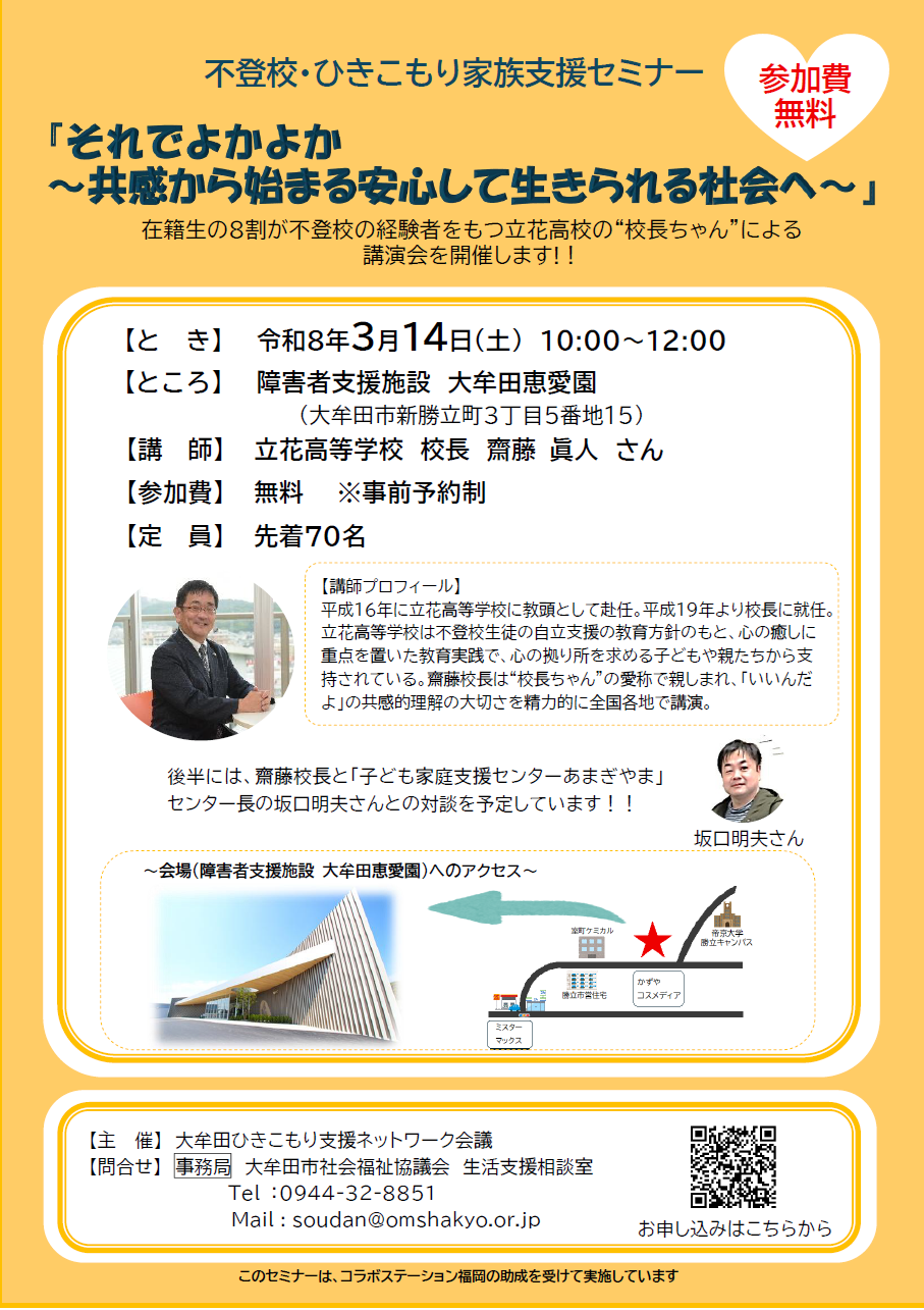 ◇日時 令和8年3月14日(土) 10:00~12:00 ◇場所 障害者支援施設 大牟田恵愛園(大牟田市新勝立町3丁目5番地15) ◇講師 立花高等学校 校長 齋藤 眞人さん ◇参加費 無料 ◇定員 先着70名 ※事前予約制 ◇主催 大牟田ひきこもり支援ネットワーク会議 不登校・ひきこもり家族の会「ふきのとう」 大牟田市社会福祉協議会 ◇問合せ 大牟田市社会福祉協議会 生活支援相談室 TEL:0944-32-8851 写真はこちら ai-jo.net/content/images/1768978544.png