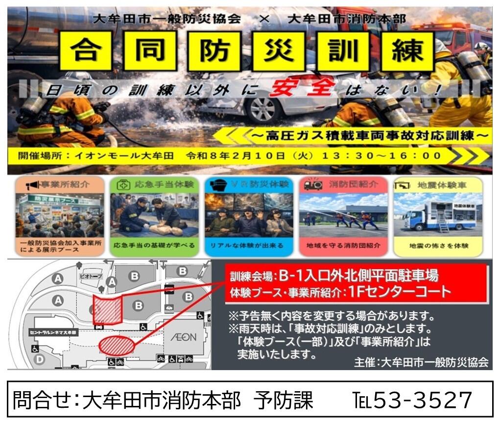 合同防災訓練 ▼とき 令和8年2月10日(火)13時30分~16時00分 ▼ところ イオンモール大牟田 ▼主な内容 ①高圧ガス積載車両事故対応訓練(北側駐車場) ②指差呼称・安全管理実演(北側駐車場) ③防災体験ブース(北側駐車場、イオンモール店内) ④一般防災協会加盟事業所紹介(イオンモール店内)