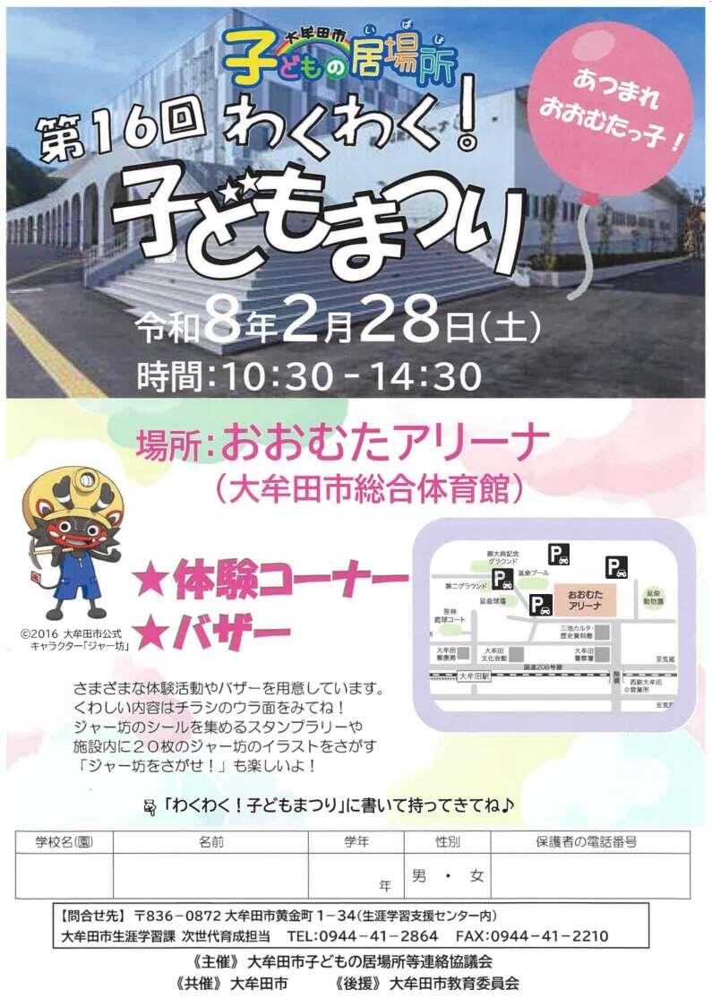 ☆と き 2月28日(土)10:30~14:30 ☆ところ 大牟田市総合体育館 (おおむたアリーナ) ☆参加費 無料(材料代がかかるものもあります) ☆主 催 大牟田市子どもの居場所等連絡協議会