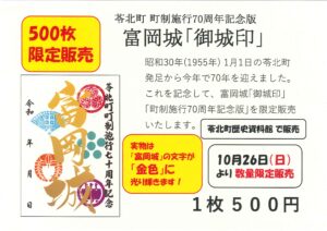 苓北町は町制施行70周年を記念し、富岡城の「御城印」記念版を令和7年10月26日(日)午前10時から苓北町歴史資料館で限定500枚販売。価格は1枚500円(2枚セット700円)。富岡城は難攻不落で「落ちない」御利益があるとされています。